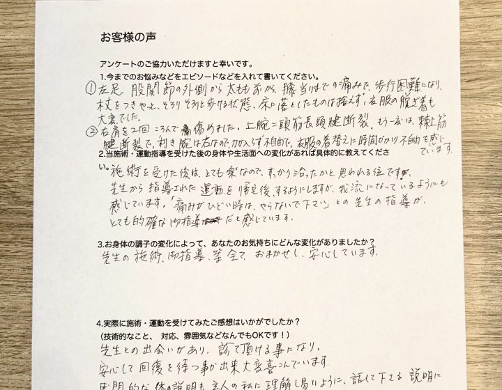 お客様より心のこもったお手紙をいただきました!人工股関節置換術後のお客様、身体と心の痛みからの解放