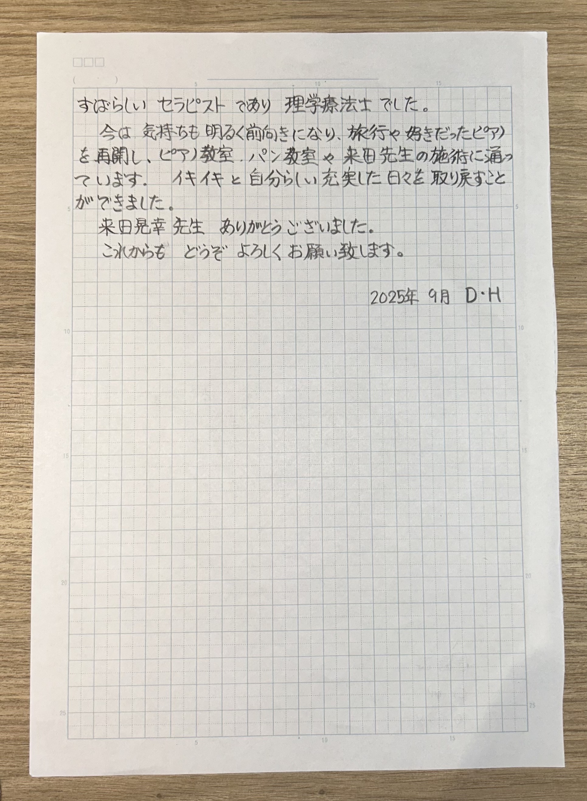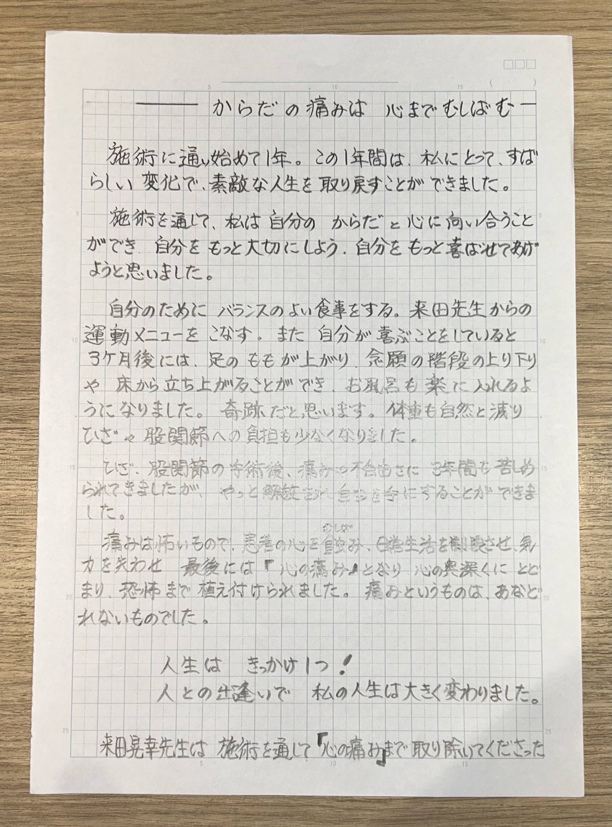 お客様より心のこもったお手紙をいただきました!人工股関節置換術後のお客様、身体と心の痛みからの解放