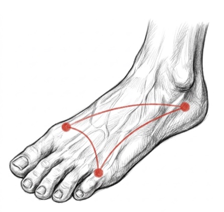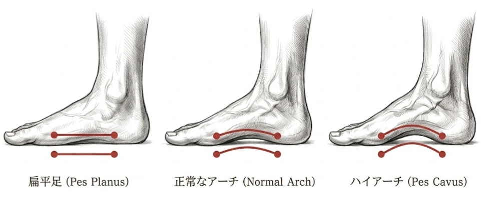 足のアーチは、骨の形だけでなく、筋肉や靭帯によって動的に支えられています。