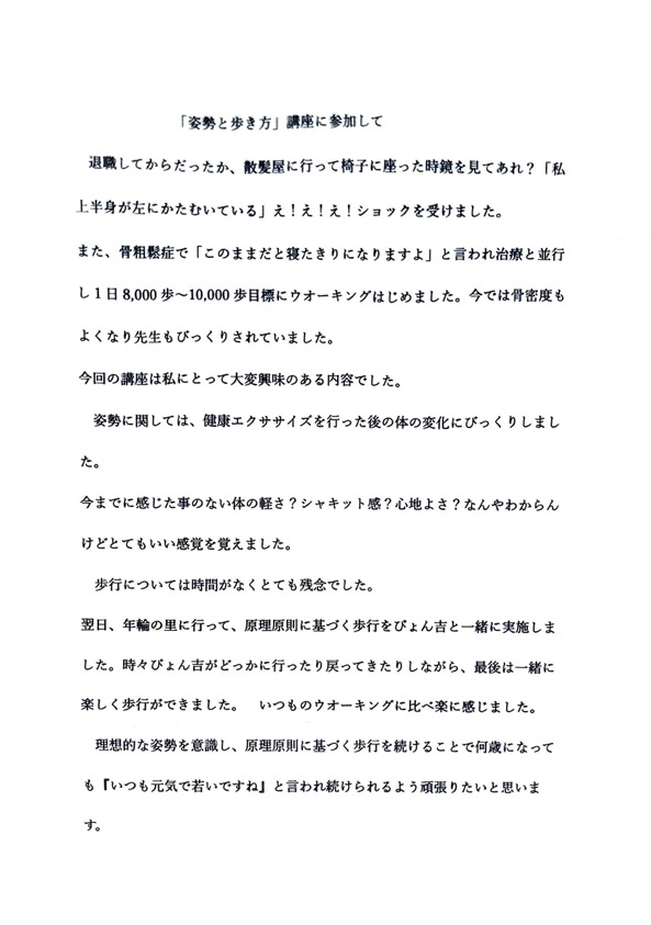 姿勢と歩行は切り離せない関係にあり、今回の講座を通じて「身体の構造と仕組み」、そして「地球上で生活する限り誰もが共通に受ける重力の影響」といった原理原則を感じ取っていただけたことを嬉しく思います。